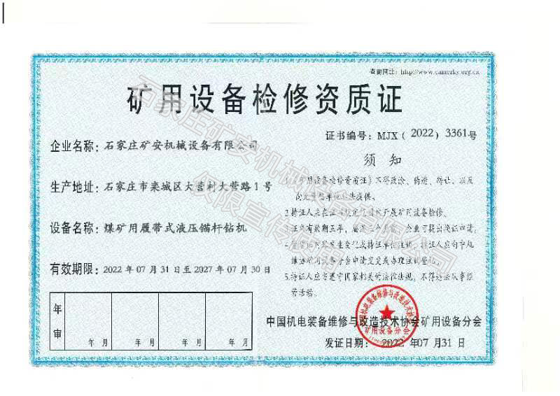 石家莊礦安機械設備有限公司成立于2011年3月,公司位于風景優(yōu)美、科技發(fā)達、交通便利的石家莊市欒城區(qū),是一家專注生產煤礦井下支護機具(錨桿鉆機)和安全鉆機(防突,架柱等)及氣動隔膜泵等礦用機械設備的********,是國內煤礦機械裝備的生產商和服務商,根據用戶需求提供井下適用的鉆機施工解決方案。公司致力于打造研發(fā)、制造、銷售、服務為一體的現代化企業(yè),全心全意為煤礦生產保駕護航。 ? 公司建有裝配車間、機加車間和調試車間,擁有嚴格的質量控制體系、先進的產品開發(fā)系統、完善的試驗檢測設施、良好的售后服務保障。先后與中煤科工集團沈陽研究院、西安研究院、太原理工大學、燕山大學等知名院校建立了緊密的合作關系。 ? 公司產品主要銷往山西、陜西、山東、內蒙古、黑龍江、云南、貴州等七十多個礦區(qū)和地方煤礦,擁有一支成熟的售后技術團隊,并且和中煤集團、華電煤業(yè)集團、華潤煤業(yè)集團、潞安集團、山西焦煤、淮北礦業(yè)等國內知名企業(yè)達成長期合作關系。 ? 公司始終秉持“讓煤礦生產更安全”的發(fā)展使命,力求誠信與創(chuàng)新,追求卓越與完美,深知“實實在在、心無旁騖做實業(yè)”,這才是本分!石家莊礦安機械設備有限公司愿與您攜手共進,共同發(fā)展!為客戶創(chuàng)造價值,提供優(yōu)質的產品和*佳的服務是我們永無止境的理念!